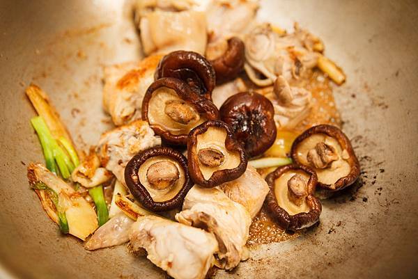 4.接著把燙過得雞肉下鍋,稍微拌炒過後加入冰糖,把冰糖炒融化。