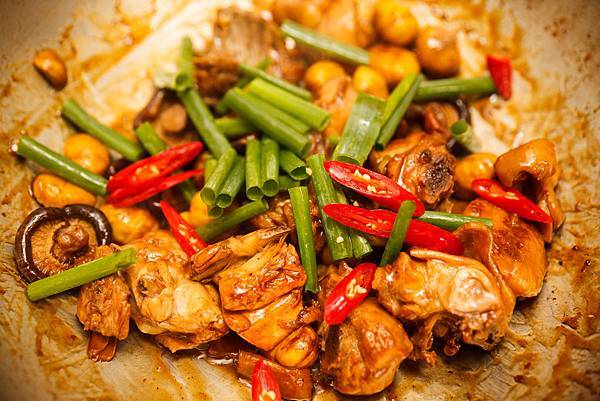 7.等醬汁約略收乾後就可以加蔥段與辣椒拌炒,直到食材熟透就可以盛盤了喔。