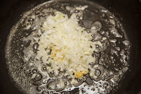2. 將奶油下鍋融化後,加入大蒜和洋蔥末炒香。