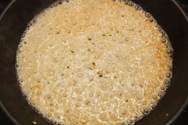 5. 等鍋中的水份快乾時再次加入高湯,一直重複這個步驟直到米飯帶有一點點米心的程度。