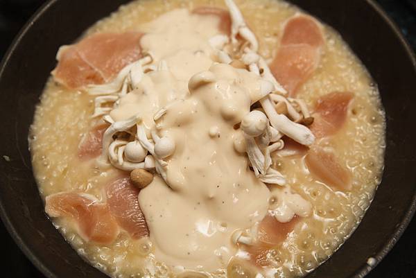6. 再來加入雞肉、雪白菇、鴻喜菇還有CLASSICO義大利麵醬-白醬拌炒。