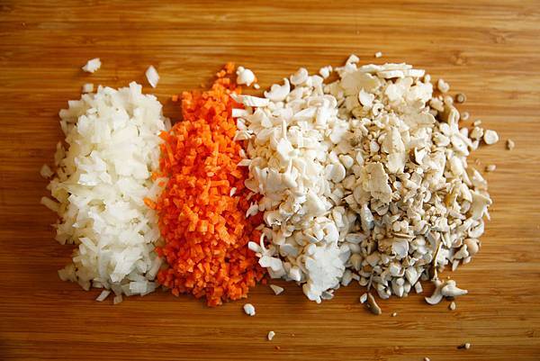 1. 首先將菇類、洋蔥;紅蘿蔔等切成細碎