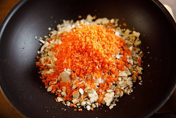 3. 再來放入紅蘿蔔、菇類炒出水份