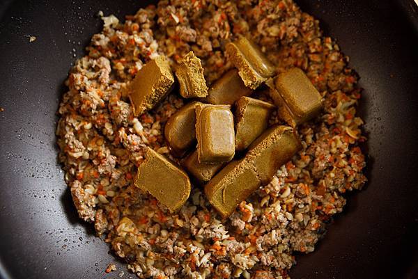 3. 咖哩塊下鍋拌炒,利用較高的溫度讓香料味道更容易散發出來。