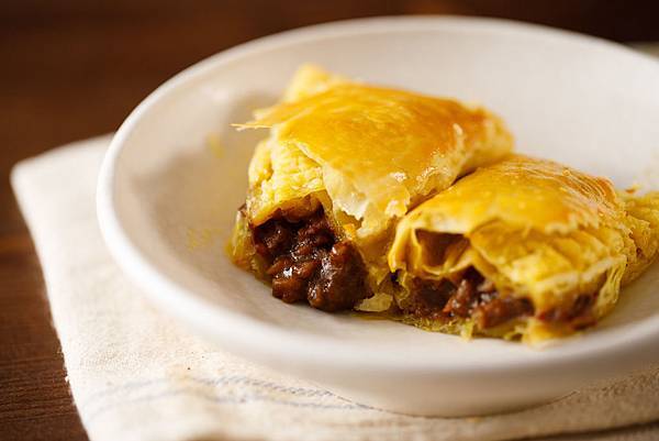 1. 首先把派皮靜置回溫後,利用派皮將日式乾咖哩包起來。