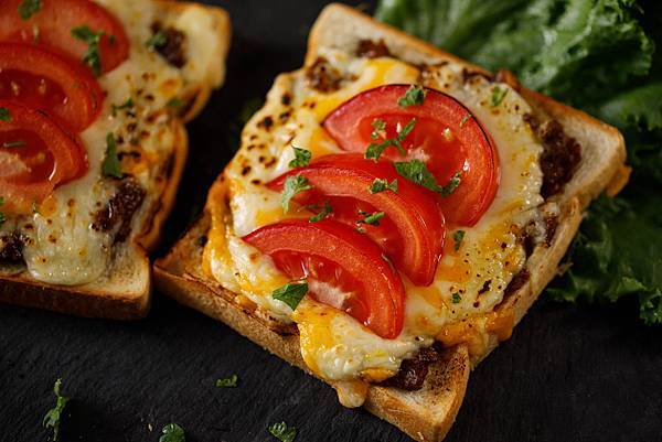2. 接著將起司絲均勻的灑在吐司上頭後,放上切塊的番茄。