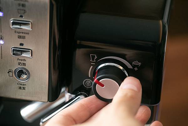 5. 放上咖啡杯並將奶泡導管調整至咖啡杯的位置後,依照需要選擇口味與份量並按下按鍵就可以了。