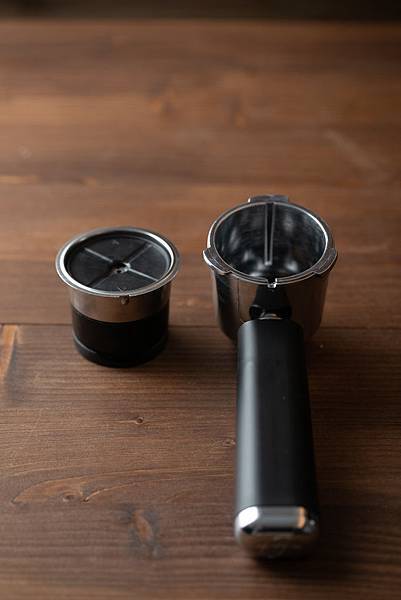 2. 接著我們使用膠囊濾杯、膠囊把手,並將膠囊裝入後放入Oster 5+隨享咖啡機。