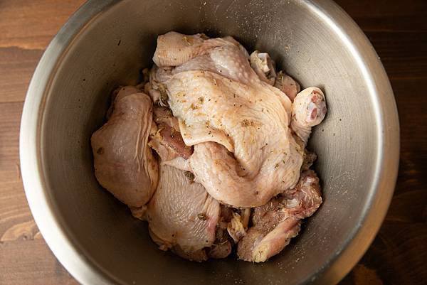 1. 首先將雞腿排與醃料均勻混合醃製約45分鐘。