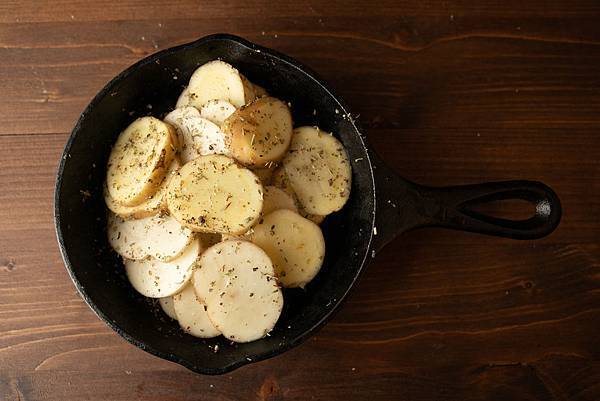 3. 將馬鈴薯切片後與馬鈴薯醃料混合備用。