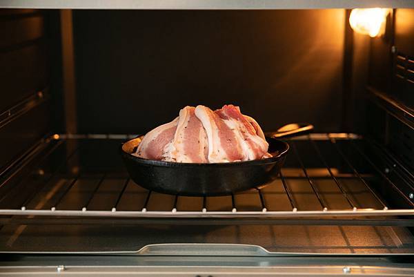 5. 將豬五花肉鋪在馬鈴薯上,並放入Oster微電腦法式雙門烤箱,用對流烘焙模式210度烘烤30分鐘。