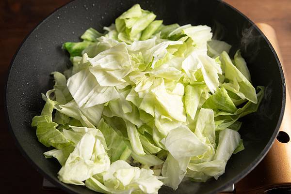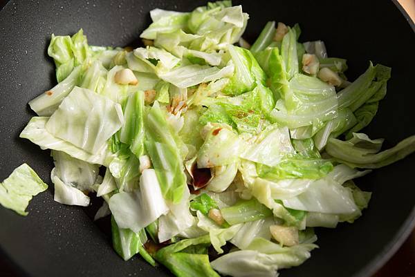 1. 首先熱油鍋,將大蒜爆香後,加入高麗菜拌炒。