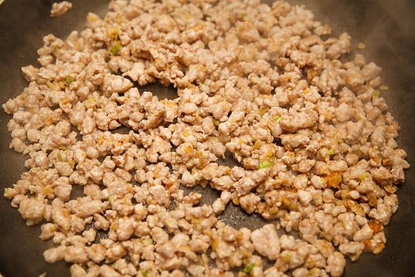 2. 接著起油鍋,先將蔥、薑、蒜末下鍋爆香後,加入絞肉拌炒。