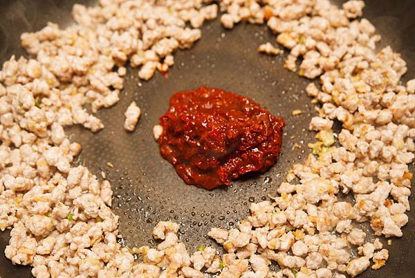 3. 再來把鍋子中間空出一個空位,加入辣豆瓣醬炒香。
