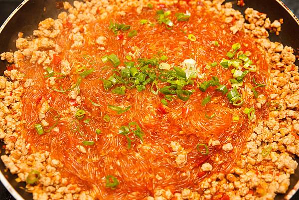 5. 最後等湯汁收乾且粉絲達到你要的軟硬度後,加入糖、醬油、白胡椒粉調味,並起鍋前在淋上花椒油和蔥花就完成了喔。