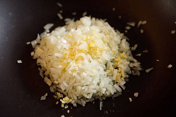 2. 起油鍋,將洋蔥、大蒜下鍋炒香後。