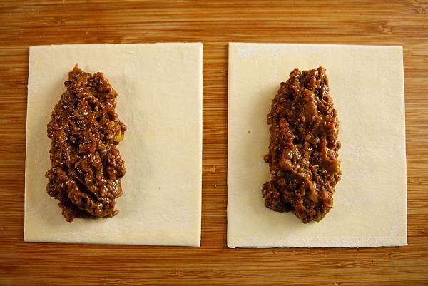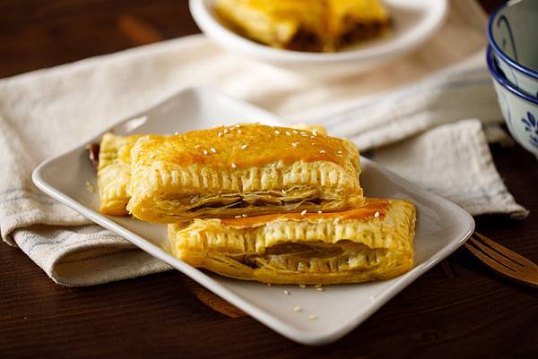 1. 首先把派皮靜置回溫後,利用派皮將日式乾咖哩包起來。