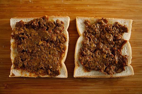 1. 首先在吐司上均勻的鋪上乾咖哩