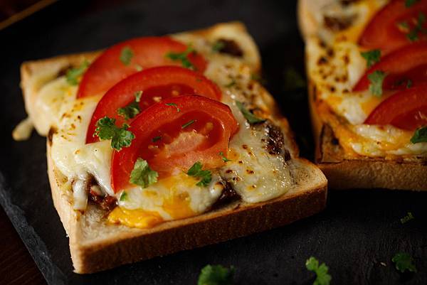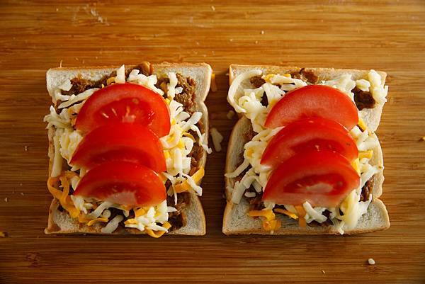 2. 接著將起司絲均勻的灑在吐司上頭後,放上切塊的番茄。